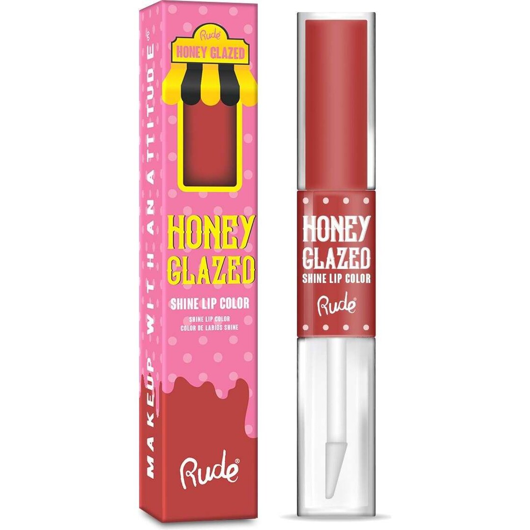 Glaze your lips with the RUDE Honey Glazed Shine Lip Color. This lipstick is a matte lipstick and color-transfer-proof lip gloss in one. Wear the pigmented lipstick alone, or glaze your lips with the ultra shine top coat for a glassy finish. Apply the pigmented lip lacquer base coat and let dry, then glaze your lips with ultra shine top coat to turn the lip color into a lip gloss.